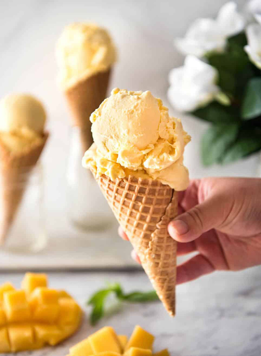 Món kem Xoài được làm từ nguyên liệu làm kem Ý tạo ra một hương vị độc đáo riêng biệt mà không có một món kem nào có được.